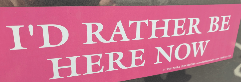 I’ve been farting around with meditation lately. It isn’t always easy. but this bumper sticker was a reminder to stick with it: