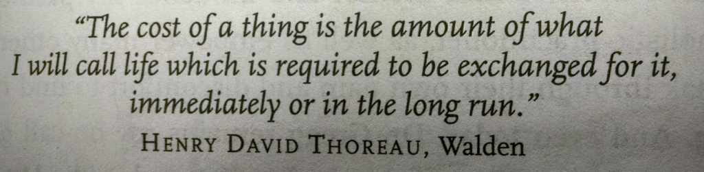 I read Walden about a year ago and loved that quote so much I wrote it down. This is exactly how I think about spending today. It’s the same idea as “Life Energy” from Your Money or Your Life.