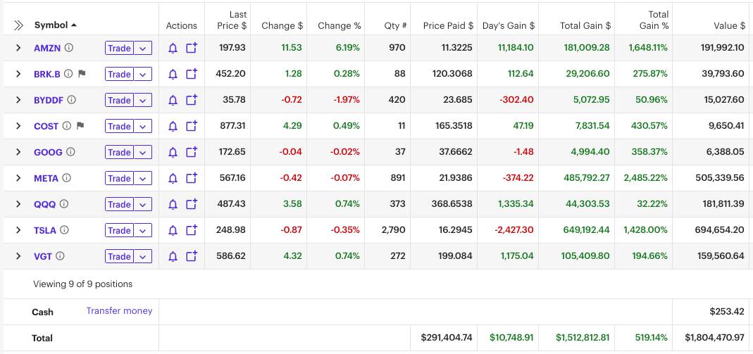 The oldest stock purchase here was Amazon in April of 2012. The newest was BYD this past February. It’s difficult to compare against the S&P 500 since the purchases are spread out. But I’ve clearly beat it since the S&P has returned about 430% since 2012.